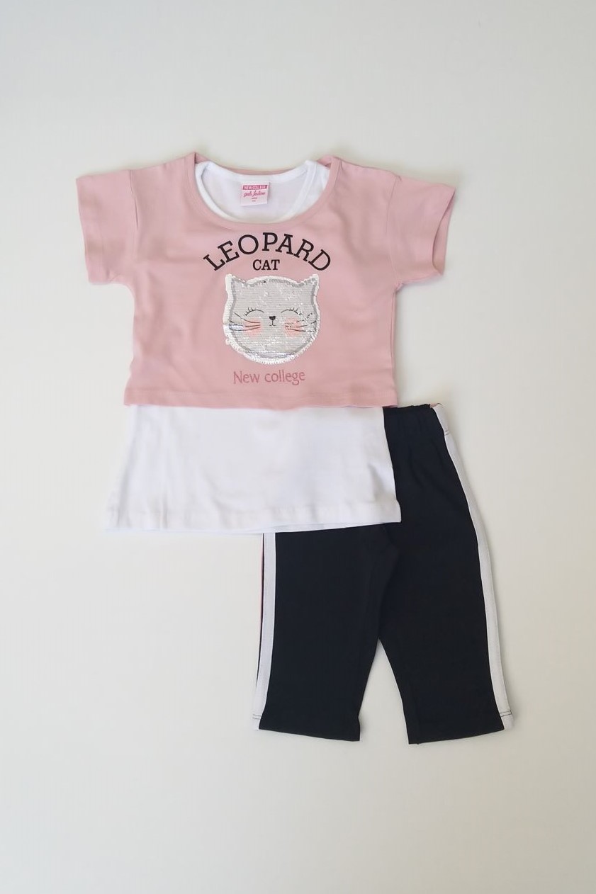 Σετ 3 τμχ για κορίτσια από 1 έως 6 ετών με κοντό μακό λαιμόκοψη μπλουζάκι με κοντό μανίκι και παγιέτες που αλλάζουν χρώμα από τιγρέ σε άσπρο γατάκι,αμάνικο λαιμόκοψη μακρύ μπλουζάκι και κολάν με ρίγα στο πλάι λάστιχο στη μέση