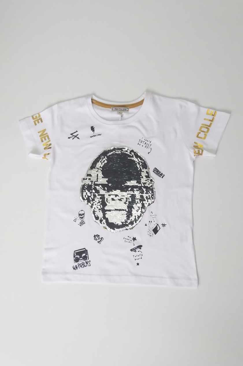 Μπλούζα για αγόρια από 6 έως 16 ετών με κοντό μανίκι, λαιμόκοψη με σχέδιο μπροστά με παγιέτες που αλλάζουν χρώμα από χρυσό σε ασημί
