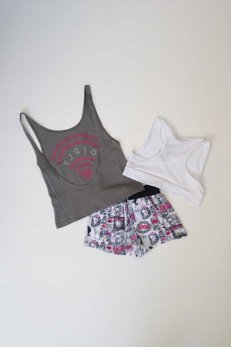 Σετ με σορτσάκι για κορίτσια από 6 έως 14 ετών με 2 μπλουζάκια με ανοιχτή πλάτη και σορτσάκι με λάστιχο στη μέση και επαναλαμβανόμενο μοτίβο