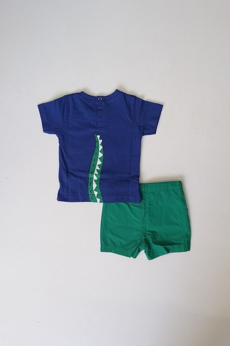 Σετ με βερμούδα για αγόρια από 6 έως 24 μηνών με μπλούζα λαιμόκοψη με κοντό μανίκι με σχέδιο στη πλάτη και υφασμάτινη βερμούδα με τσέπες και λάστιχο με κουμπάκι εσωτερικά για ρύθμιση του μεγέθους