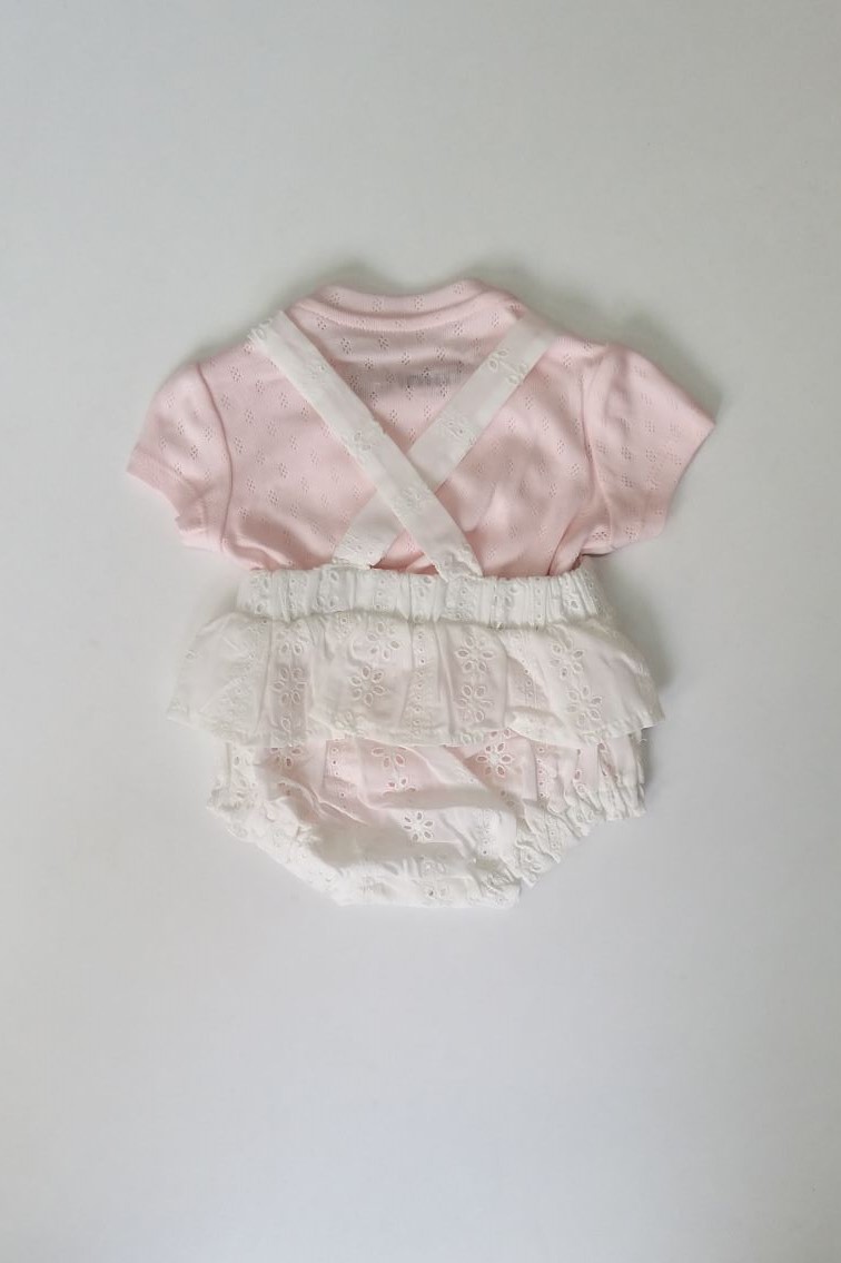 Ολόσωμο σετ για κορίτσια από 0 έως 12 μηνών από δαντέλα, κλείνει με τρουξ από κάτω, χιαστή στο πίσω μέρος και μπλουζάκι κιπούρ με κοντό μανίκι και τρουξ στο πλάι για πιο εύκολο άλλαγμα του μωρού