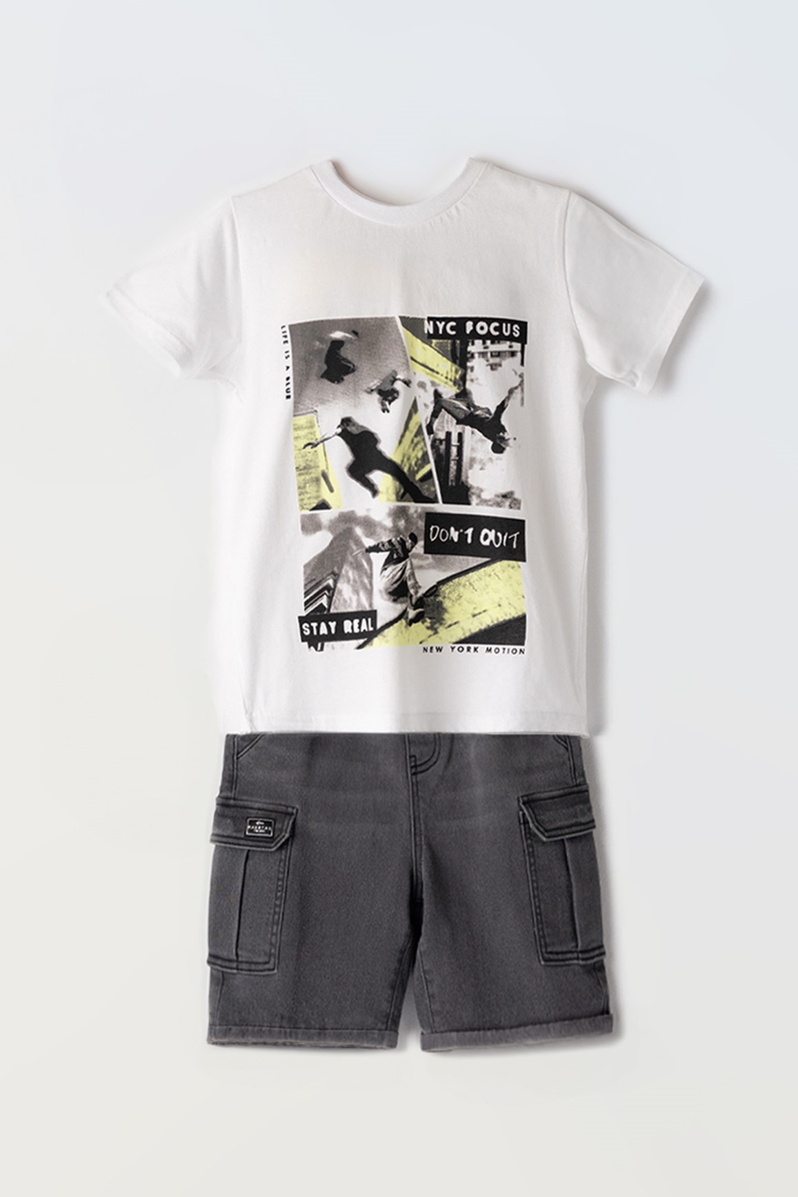 Σετ με βερμούδα για αγόρια από 6 έως 16 ετών με μακό λαιμόκοψη μπλούζα με κοντό μανίκι και τζιν ελαστική βερμούδα με τσέπες στο πλάι και λάστιχο με κορδόνι στη μέση