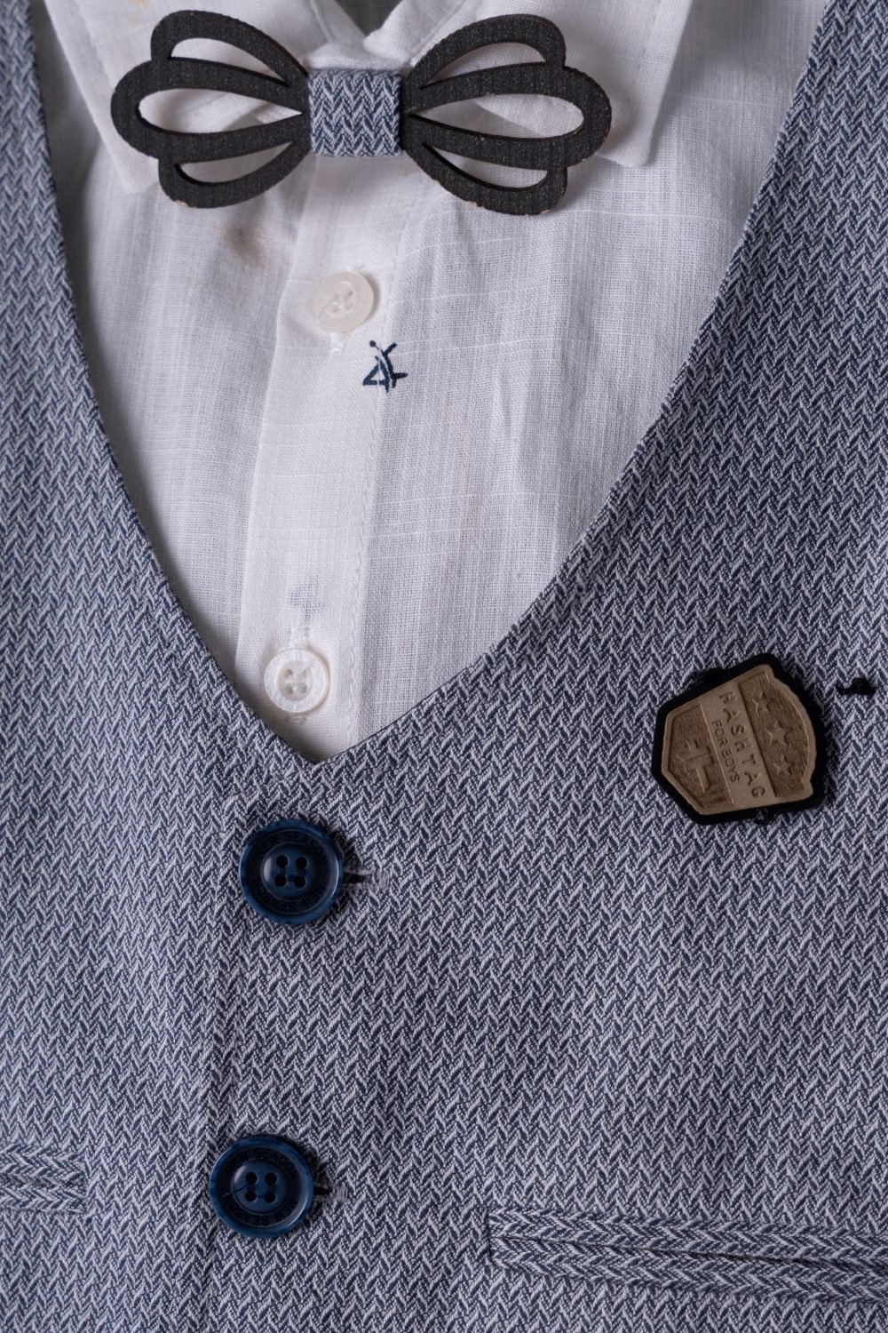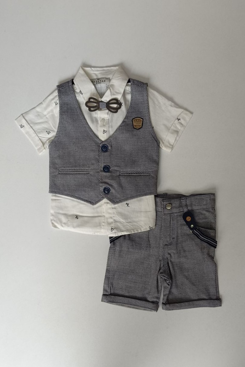 Σετ με βερμούδα για αγόρια από 1 έως 6 ετών με πουκάμισο με επαναλαμβανόμενο μοτίβο,ξύλινο παπιγιόν ,γιλέκο που κλείνει με κουμπάκια και βερμούδα με εσωτερικό κουμπάκι με λάστιχο για ρύθμιση του μεγέθους.Διαθέτει και τιράντες.