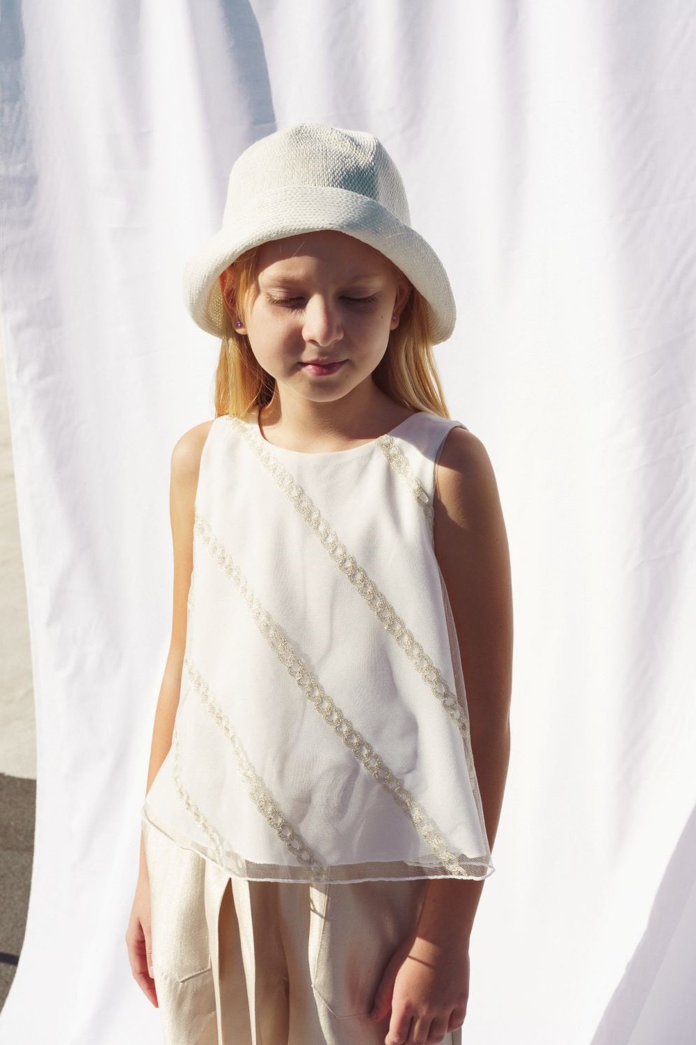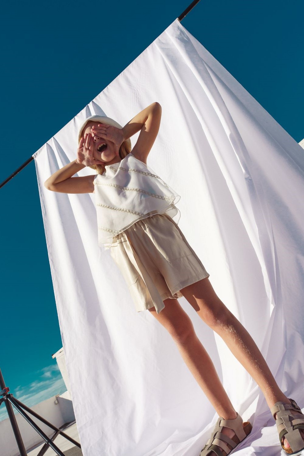 Σετ με σορτς για κορίτσια από 6 έως 16 ετών με αμάνικη μπλούζα σε άλφα γραμμή με κουμπάκι από πίσω και σορτς με ζώνη και λάστιχο στη μέση