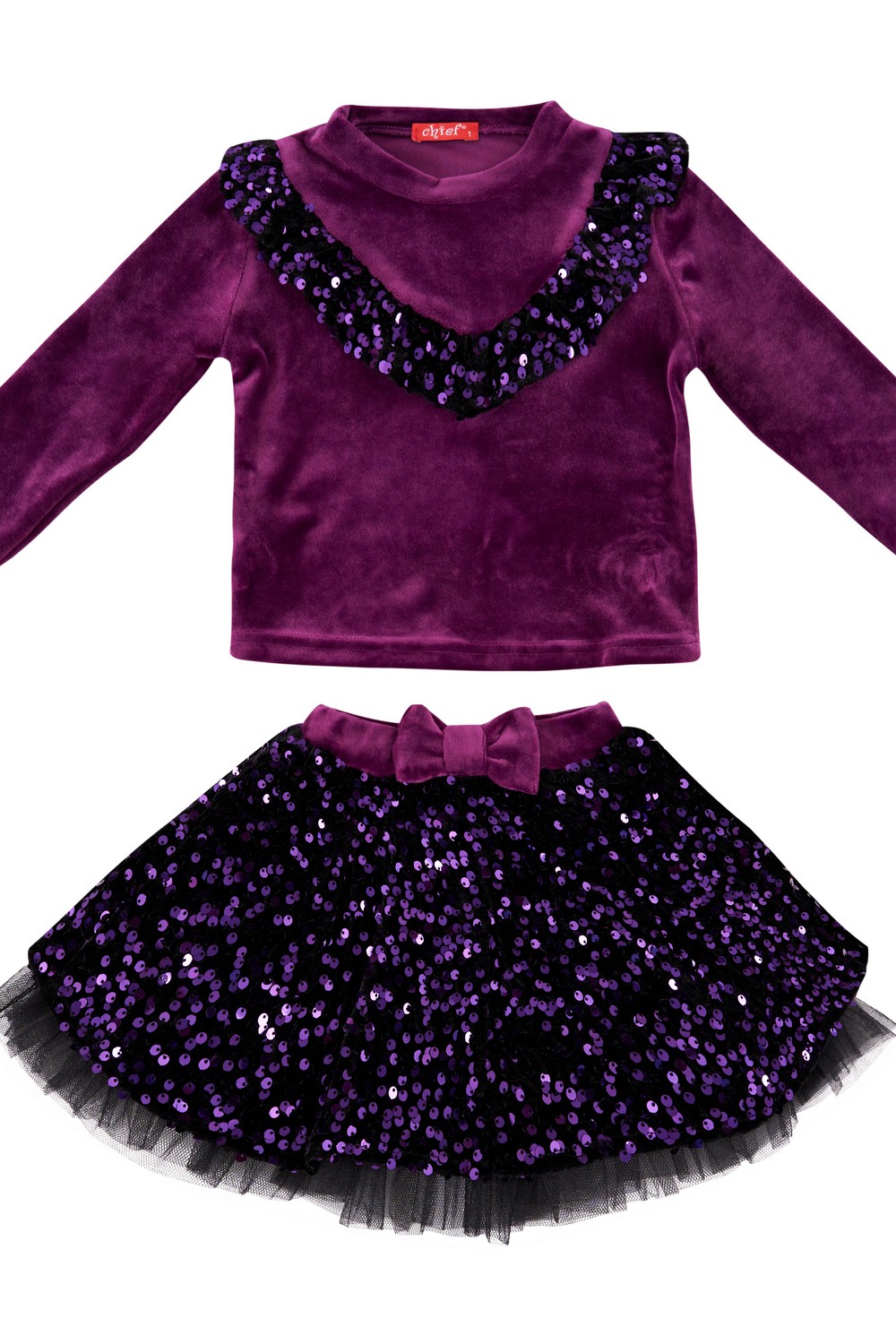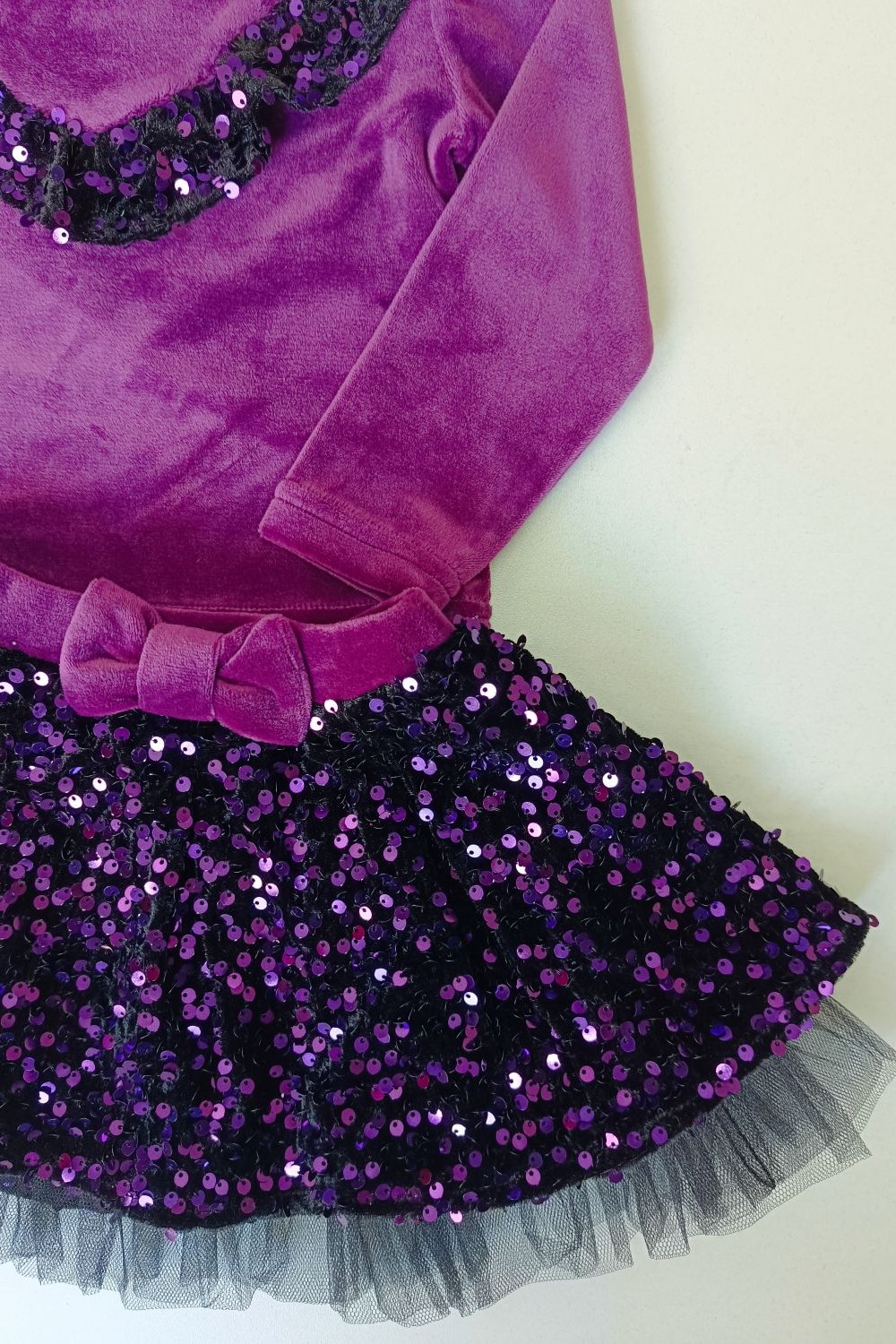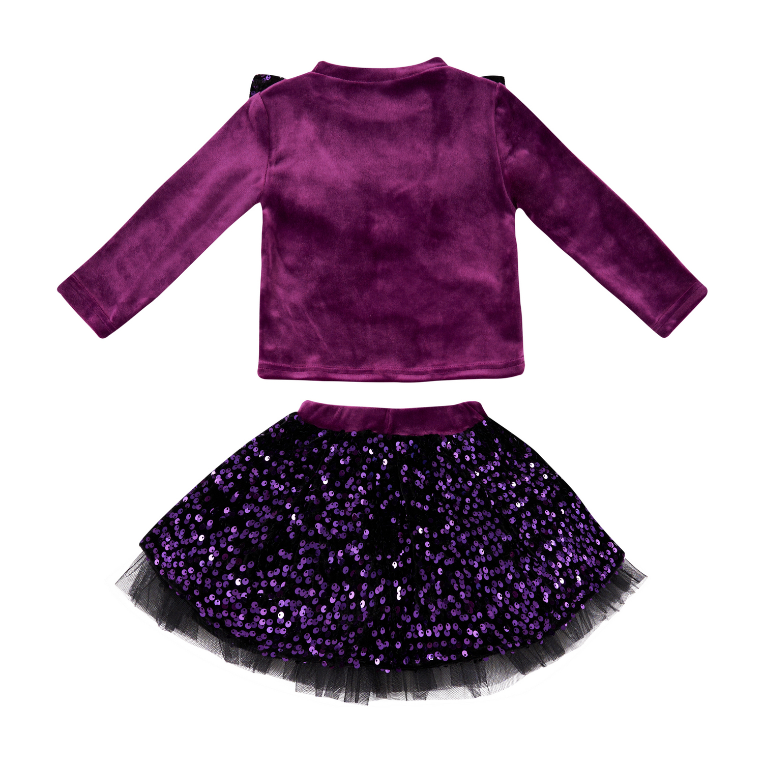 Βελουτέ σετ με φούστα για κορίτσια από 1 έως 5 ετών με μπλούζα λαιμόκοψη με μακρύ μανίκι με λεπτομέρεια με παγιέτες και φούστα με παγιέτες, τούλι στο κάτω μέρος και λάστιχο στη μέση
