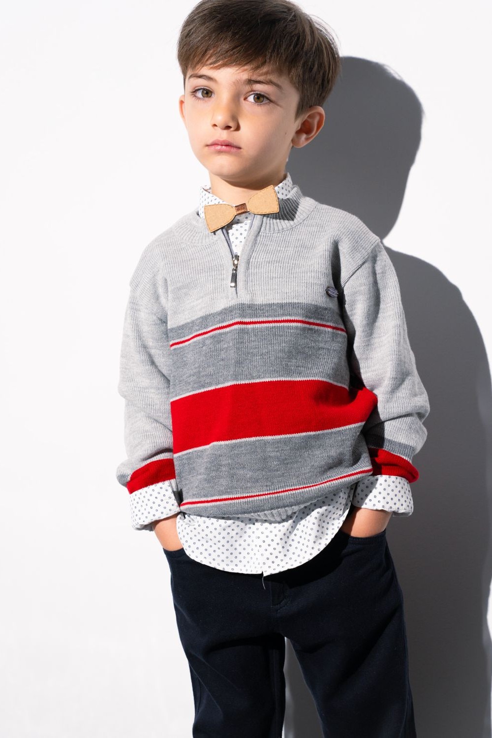 Σετ με παντελόνι για αγόρια από 1 έως 6 ετών με πλεκτή μπλούζα , πουκάμισο με επαναλαμβανόμενο μοτίβο,ξύλινο παπιγιόν , τιράντες και ελαστικό παντελόνι με εσωτερικό λάστιχο με κουμπάκι για ρύθμιση του μεγέθους