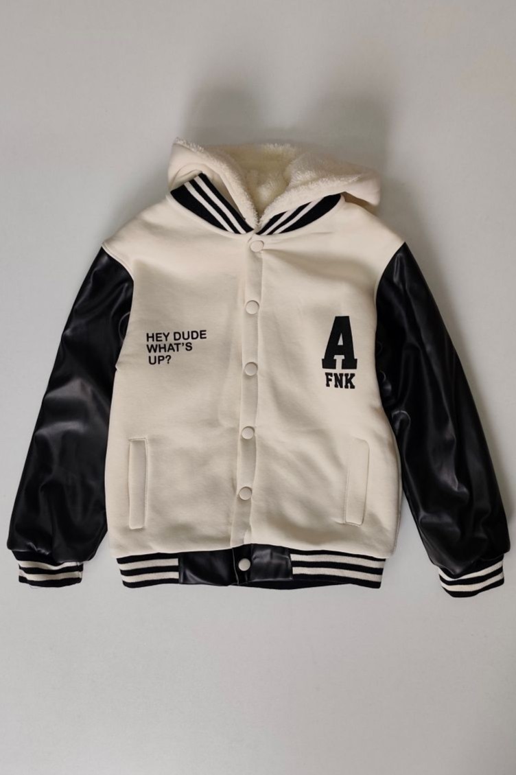 Χοντρή ζακέτα για αγόρια με κουμπιά, κουκούλα, δερματίνη μανίκια και εσωτερική γούνα. Έχει σχέδιο στην πλάτη