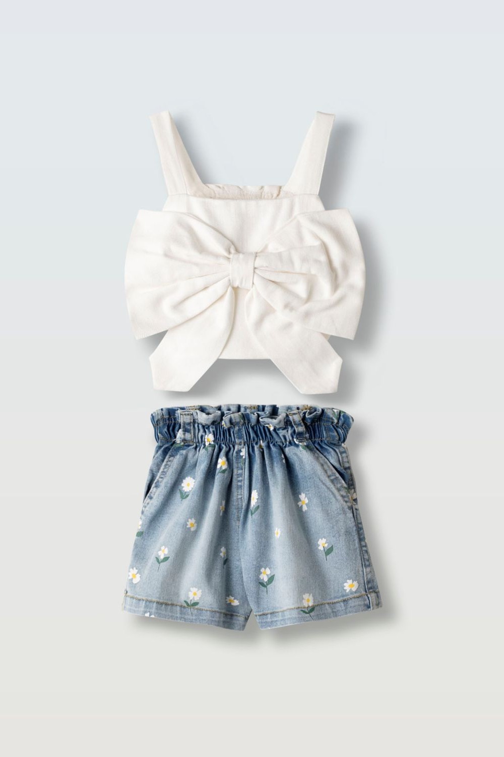 Σετ με σορτσάκι για κορίτσια από 2 έως 5 ετών με κοντό μπλουζάκι με φιόγκο και τζιν σορτσάκι με λάστιχο στη μέση